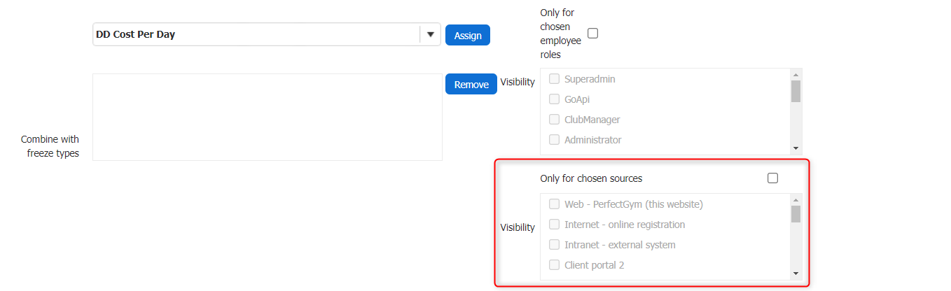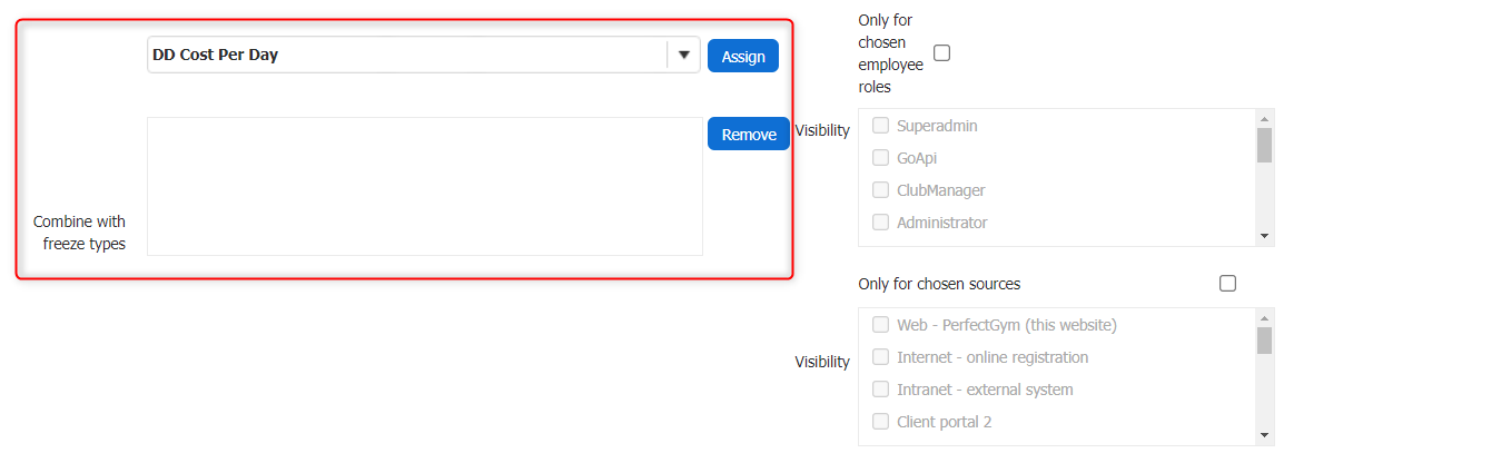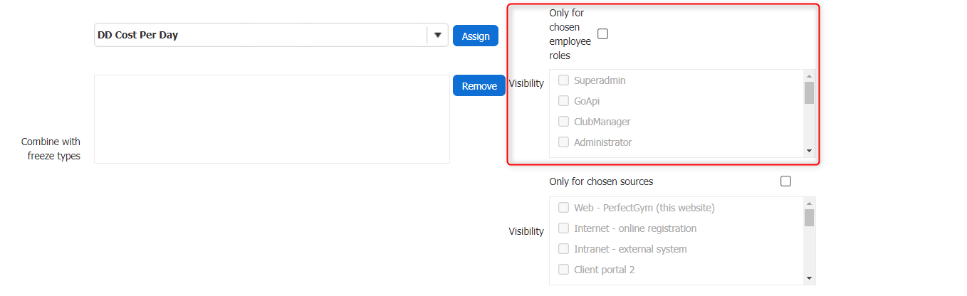 Only for chosen employee roles - Tick this checkbox if you want to grant access to the Freeze type visibility to a specific role, i.e. Club Manager. In this case, roles other than this specific one will not be able to see this Freeze type configuration option.
