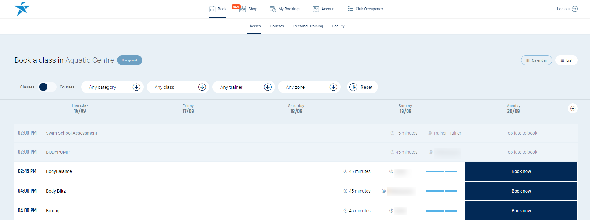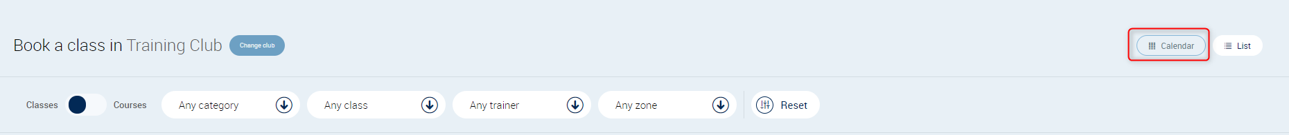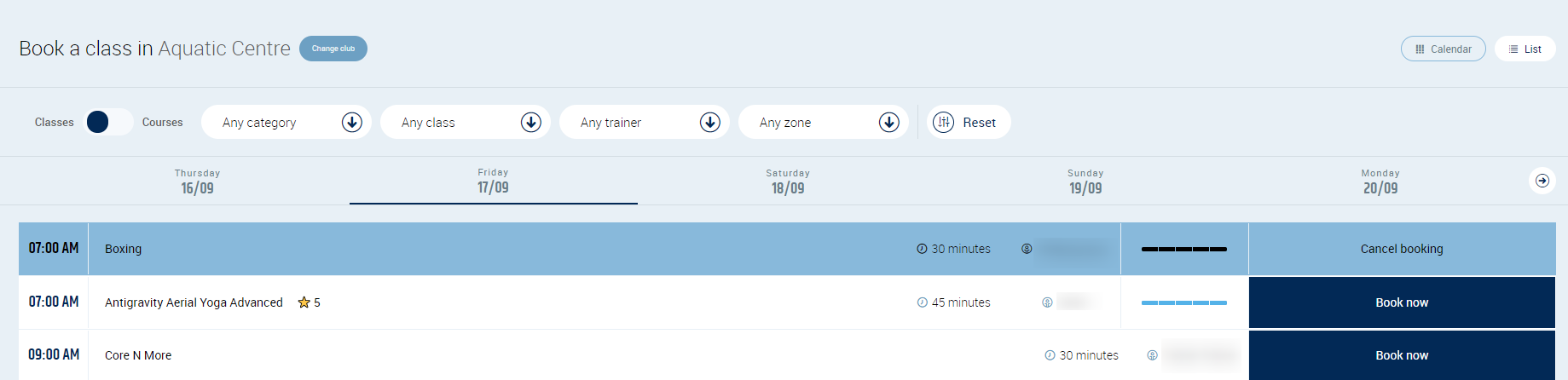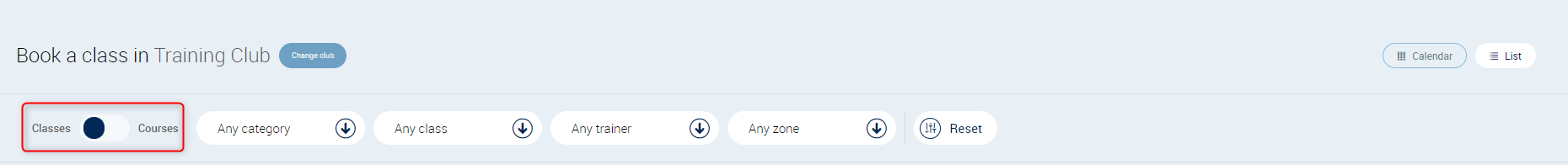 Classes / Courses toggle - Ability to toggle between single classes and course/group classes. The course/group classes are individual classes which a club member could enrol into a single class. If they need to enrol into the group, use the course tab.