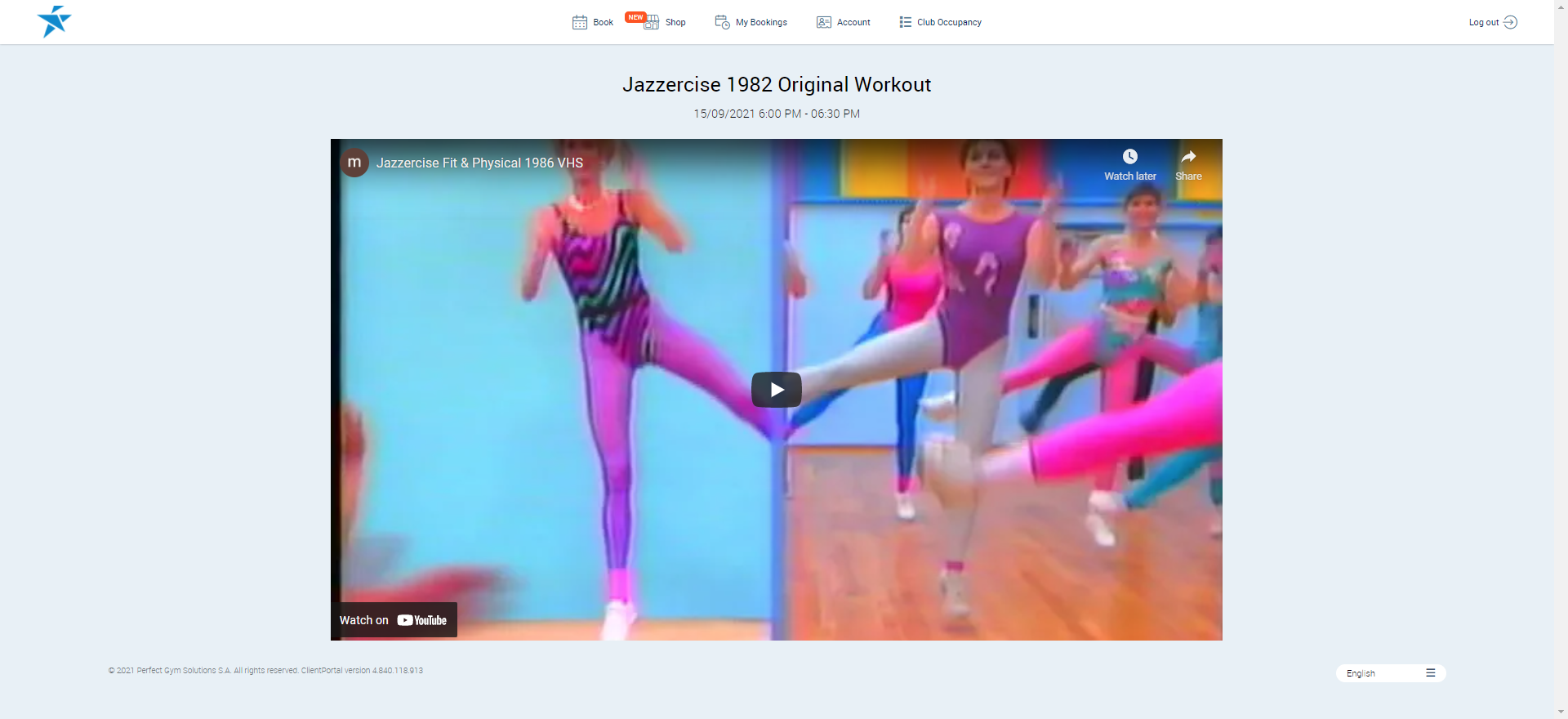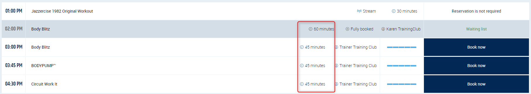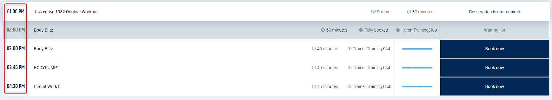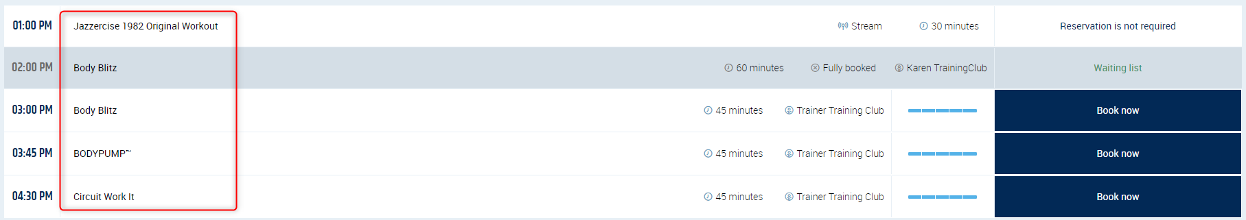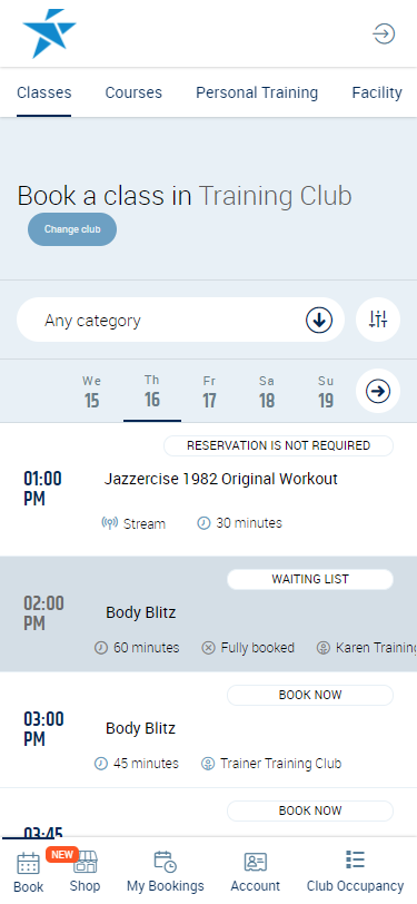This is where the club member can book or cancel a class. This may also specify if the class is full, has a waiting list, reservation is not required to book or if its too early/late to book.