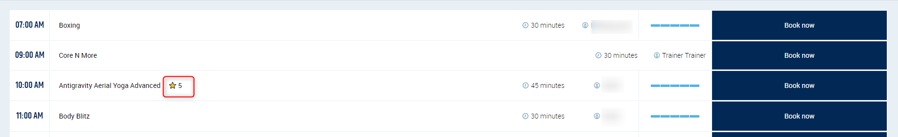 Ratings - Club members can rate classes they have participated in. This will display the average rating given on the class, more information on the set up can be found here.