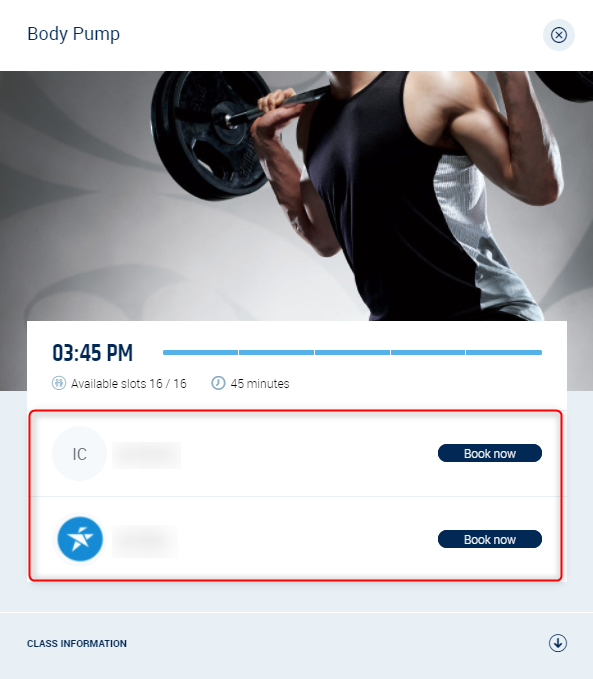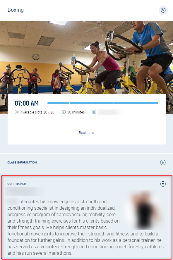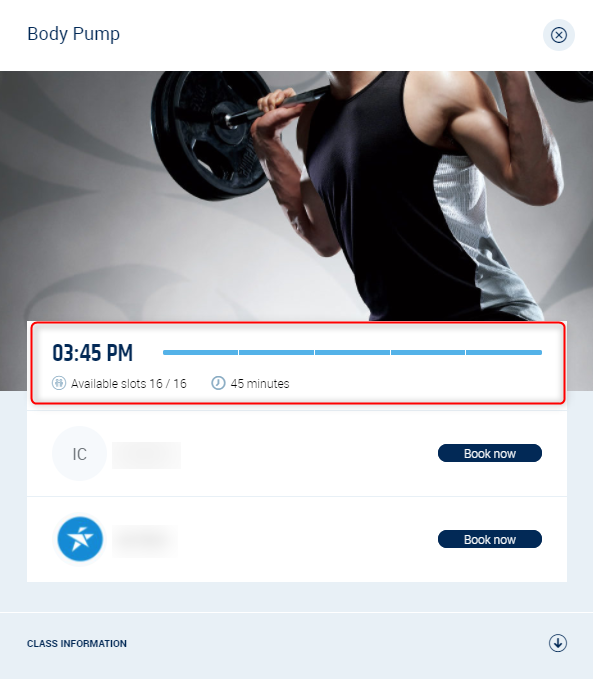 Class information- By default, class information is hidden by default, with the club member having to press the down arrow to reveal the information,