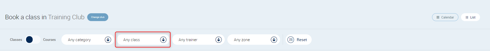 Reset - Reset all filters displayed here, and will list all classes in the club.