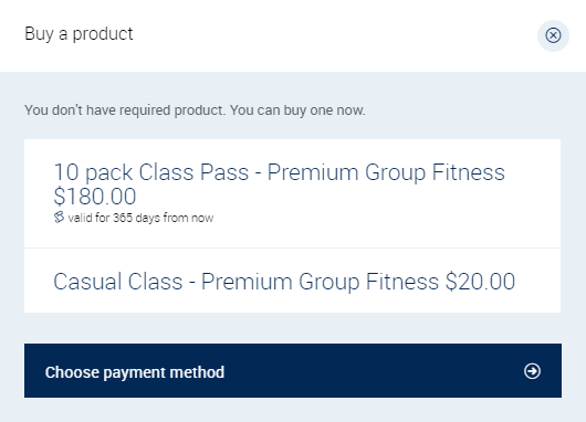 When the club member presses Book now to enrol into the class, however do not have the required casual booking product for the class. They will be presented with a list of products that they can buy before booking the class.