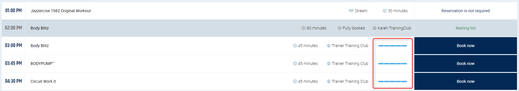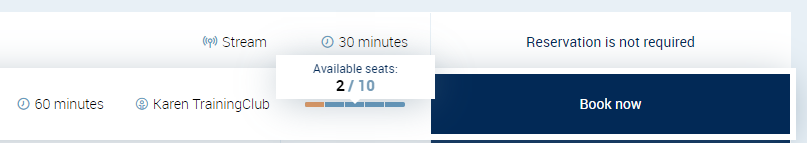 Listed below are two examples of what the capacity looks like when there are limited spots in the class. A club member can hover over this to see how many spots are left in the class.