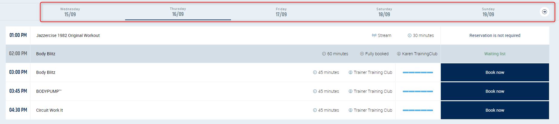 Date - This displays the date of the classes for the next 5 days (List view) or 7 days (Calendar view)
