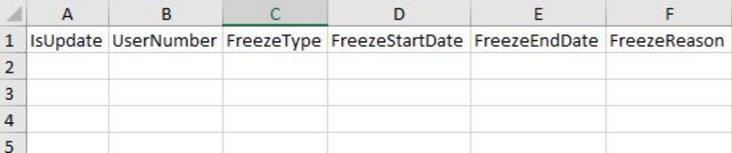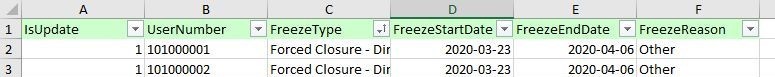 - Column C - FreezeType - this is the name of the freeze you are creating, i.e . “Forced Closure - Upfront”. This name has to be identical to the one created at the beginning of this process.
