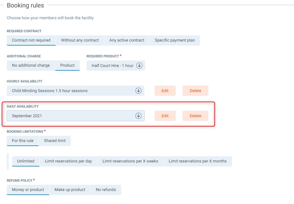 Daily availability will restrict the use of the facility booking rule to only be used between a date range. This can be useful for pricing within certain peak periods such as school holidays.