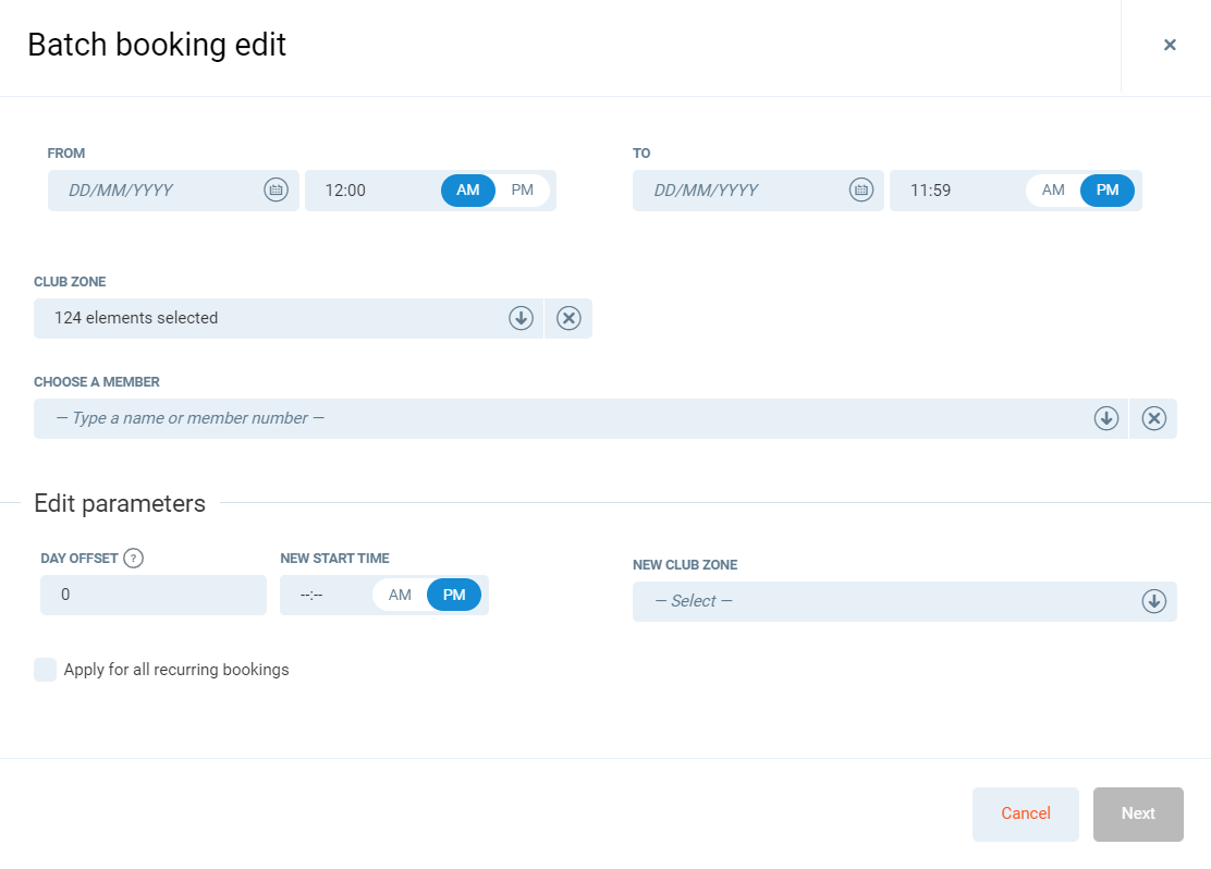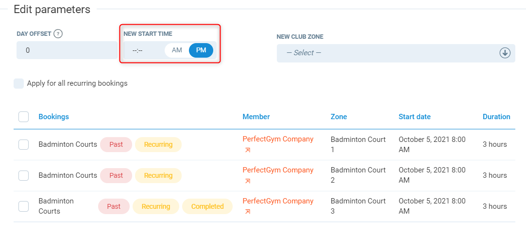 New start time - Select the new start time for the selected bookings. If blank the start time will remain as is.