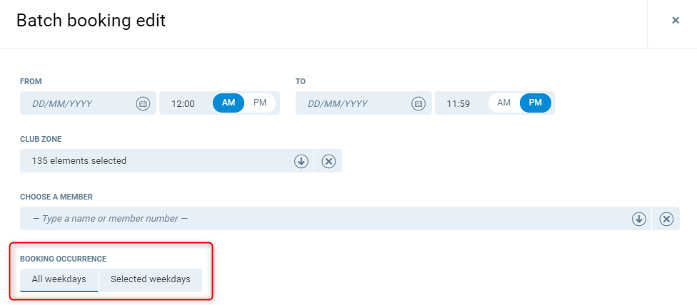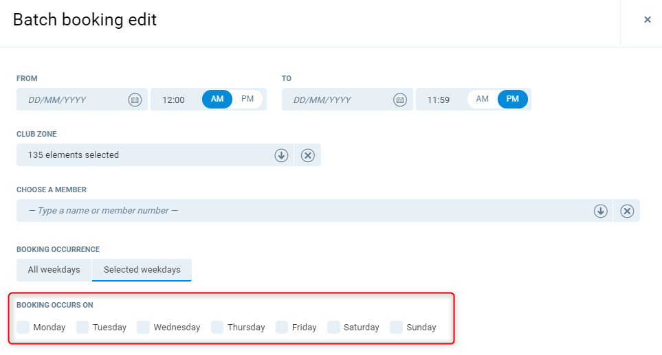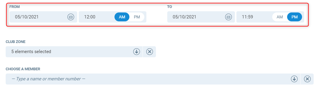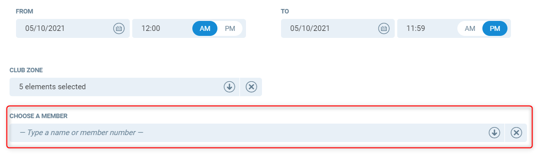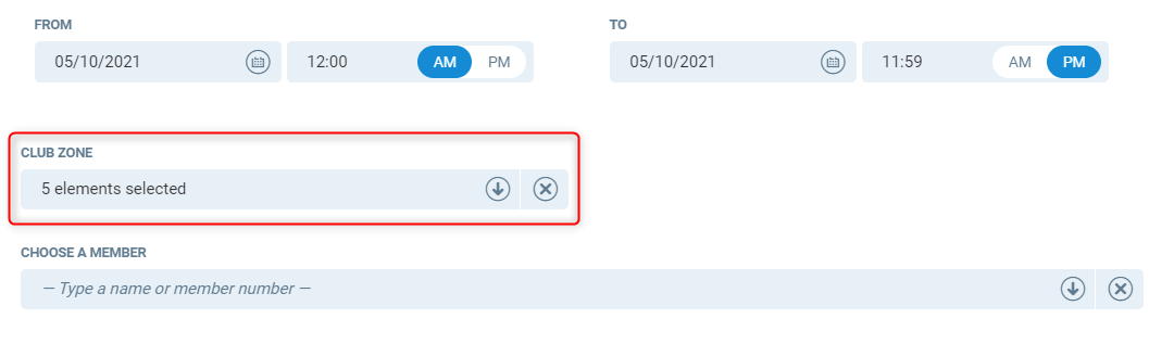 Club zone - Select bookings made in the zones selected. Pressing X will clear all zone from view. Use the drop down to select new zones.