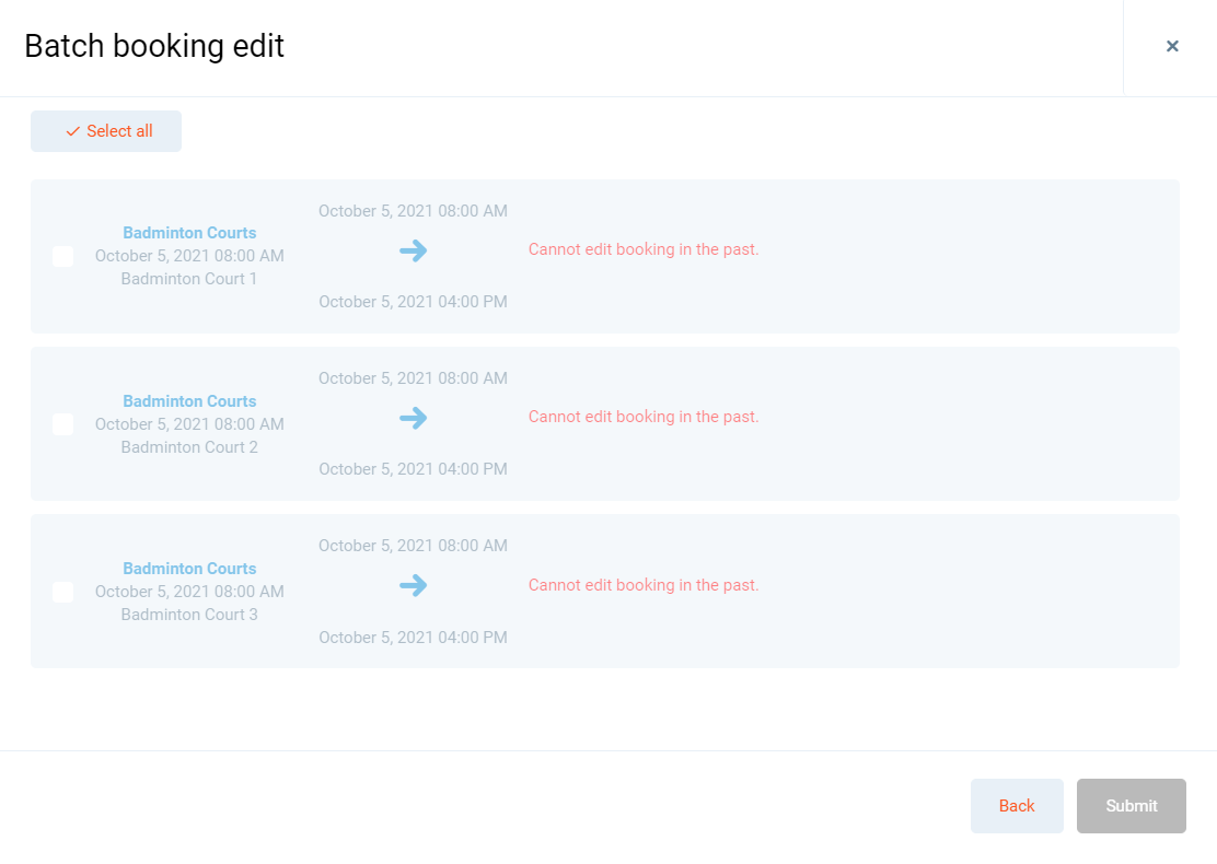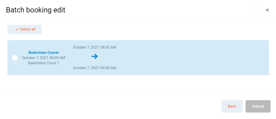 If no conflicts, then you will be presented with what will be changing on screen. Select the tick box next to the booking will confirm the edit, press select all will tick all bookings to be edited.