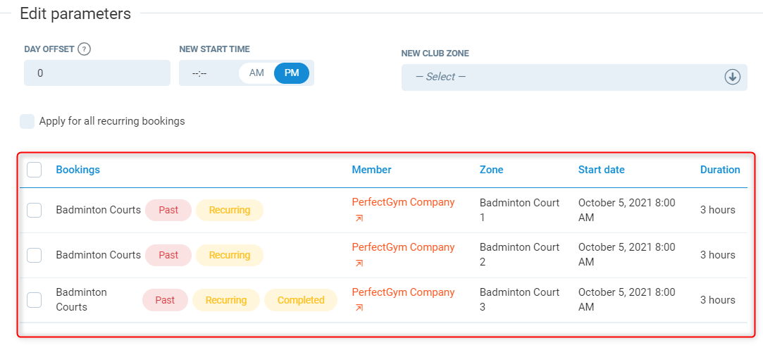 After selecting these values, Edit parameters will display all bookings within the parameters listed here.