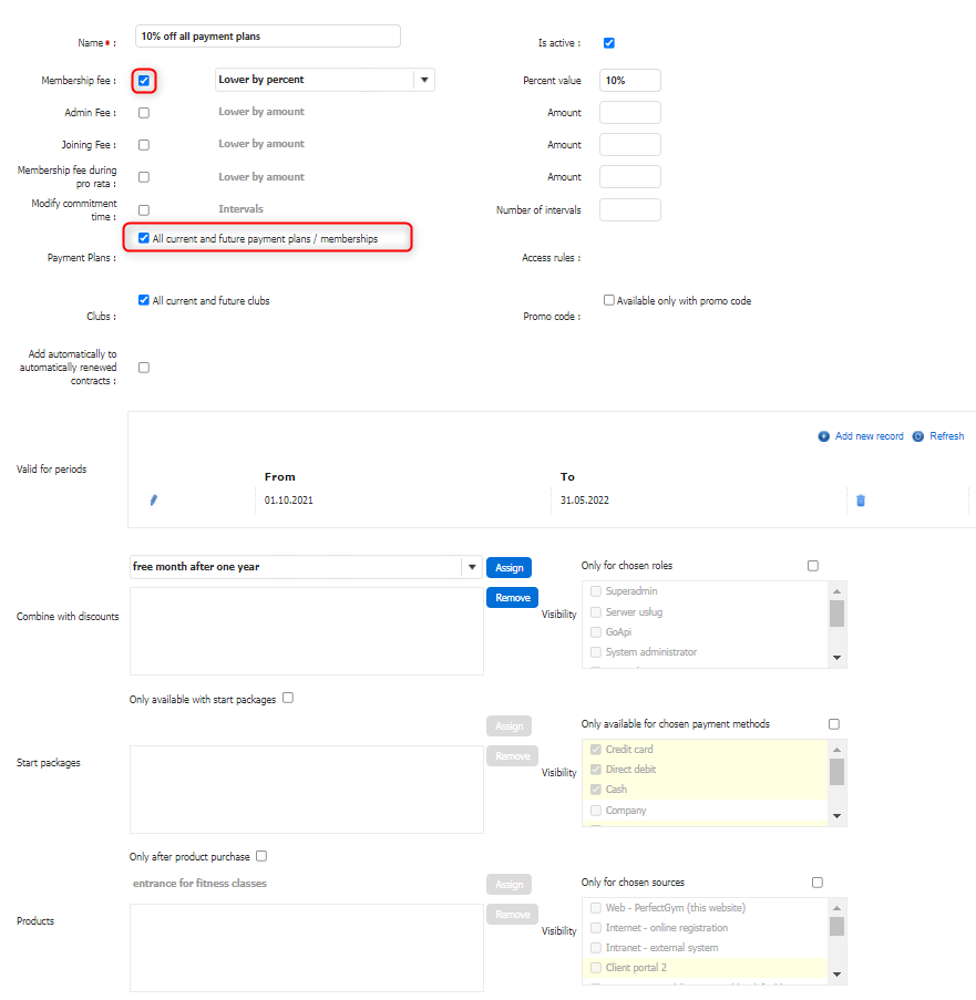 You can adjust the Discounts configuration to your own business needs understandably, i.e.: you can enable them only for chosen clubs and chosen Payment plans. However, make sure you have the below options set up accordingly!