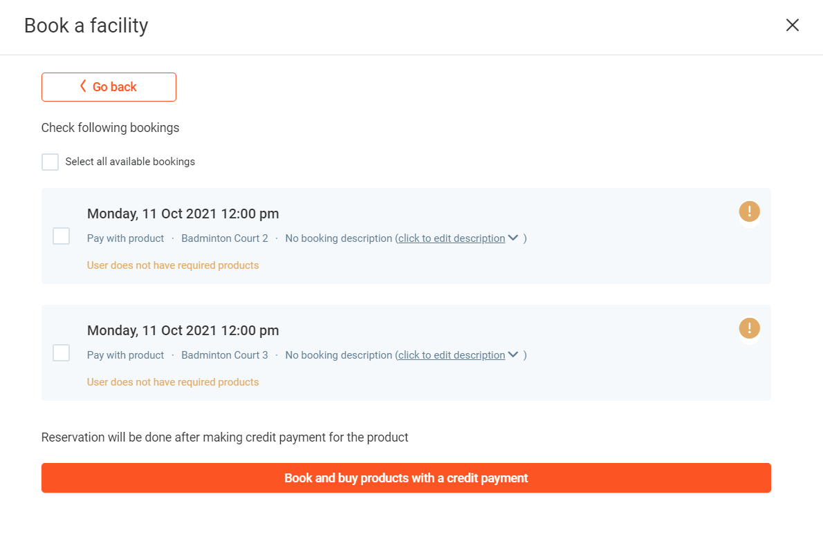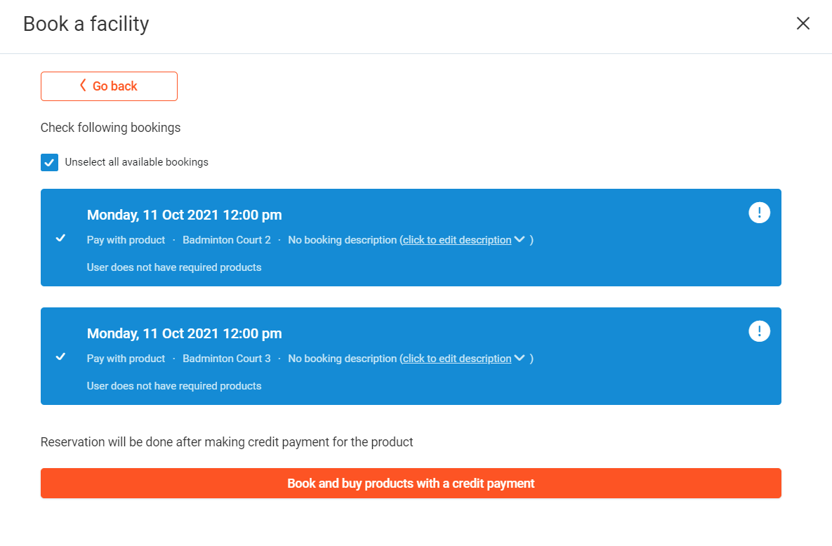 This will display a list of options for the facility booking.