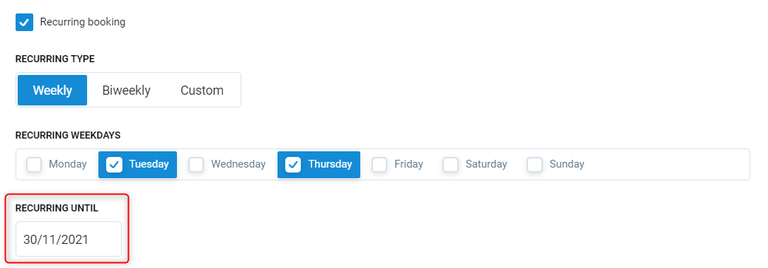 Recurring until - Select the end date that the recurring bookings will finish.