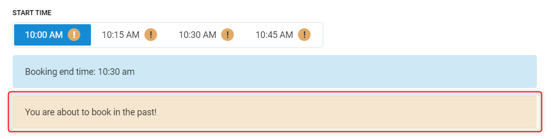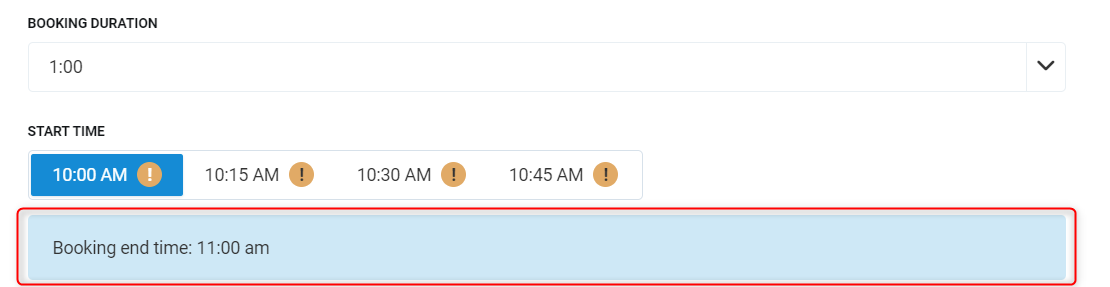 Booking end time - Based on the values selected in Booking duration and Start time, this will calculate the end time.