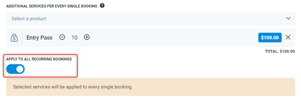 Recurring booking - If using recurring booking and/or multi zone booking, you have the option to apply the products to all bookings or a single booking only.