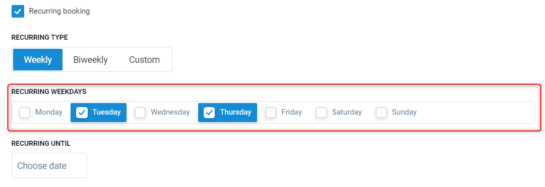 Recurring weekdays - Select the days in the week this booking will take place.