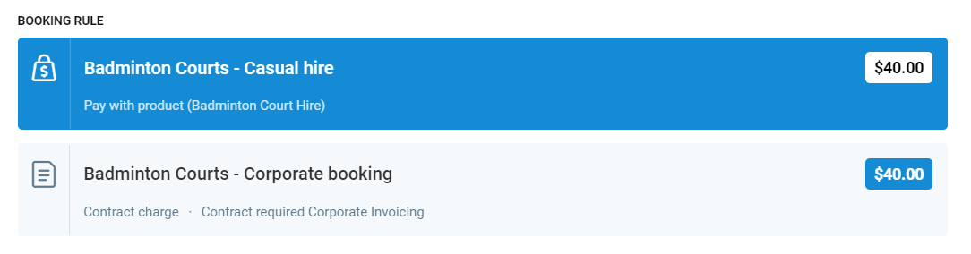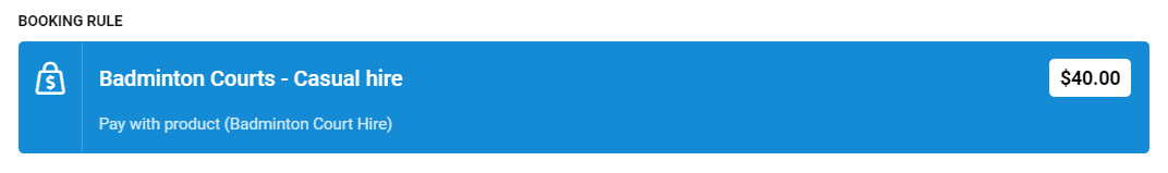 Product - This will display the cost of the product, and the product name under the facility booking name. The price of the product is the cost per interval.