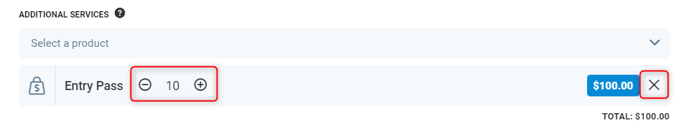 Additional services - Add a service product to the booking phase. Select the product from the list by typing its name.
