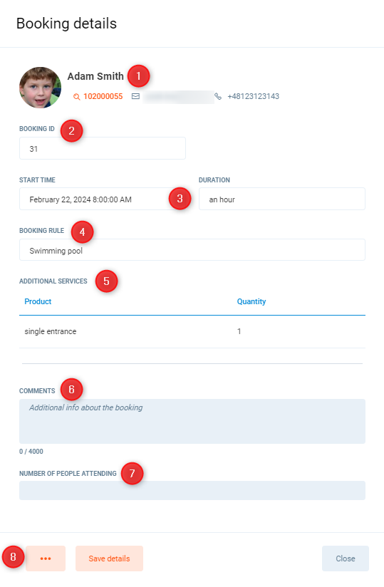 7. Number of people attending - display the number of people attending the booking.