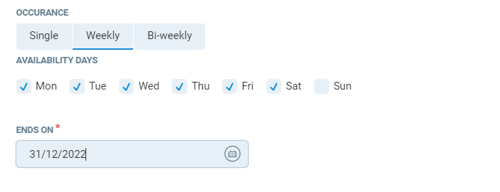 - Bi-Weekly - This will create availability on a bi-weekly schedule, this will recur from the week of the duration start date.
