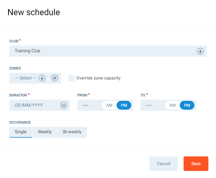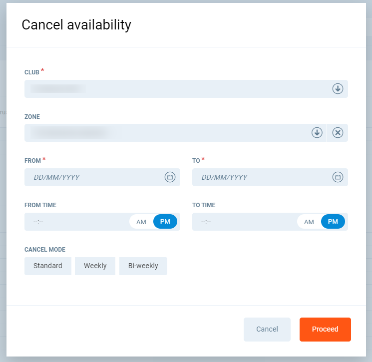 - if you want to cancel availability for specific time of the day, select the Club and Zone, specify the dates, then enter the From time and To time for the slots you want to cancel.