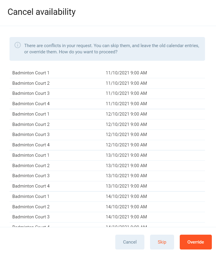 If there is previous zone availability already set and this new availability is overriding any part of the previous schedule. The following screen will display asking you to skip or override all schedules.