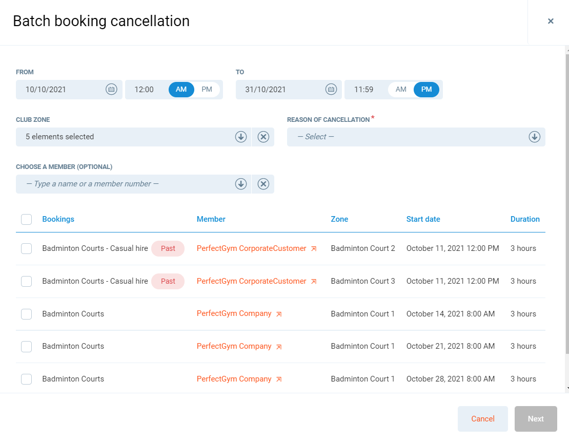 8. Batch booking cancellation window will appear. Select which activities you want to cancel.
