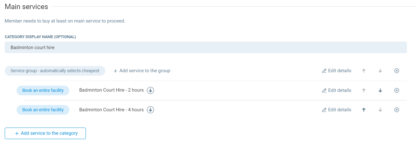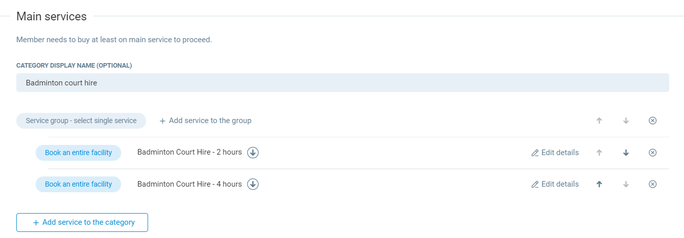 To create the main service of the facility booking screen for club members to book, press Add service to this category. Additional options will be displayed, however only the first two options need to be selected here.