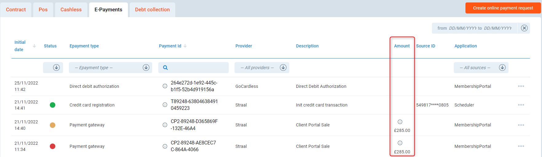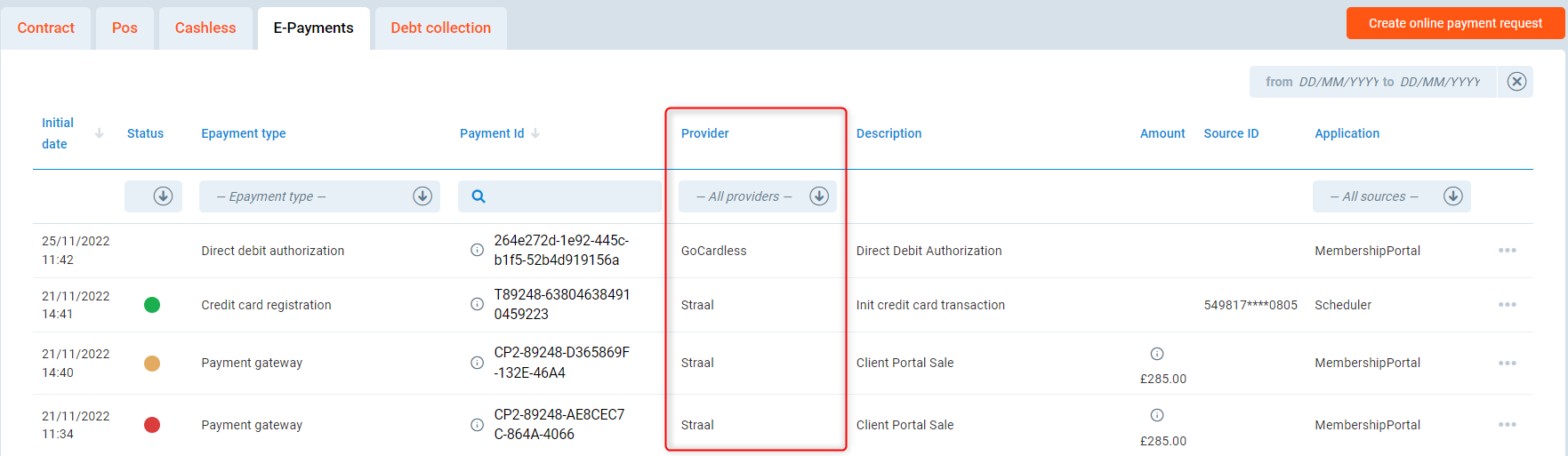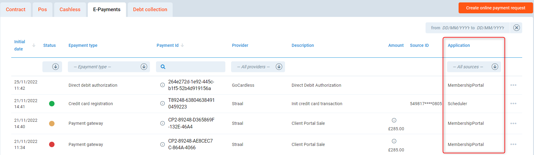 Application - displays the application by use of which the payment was done, i.e. Membership Portal (here meaning Client Portal) or PGM.