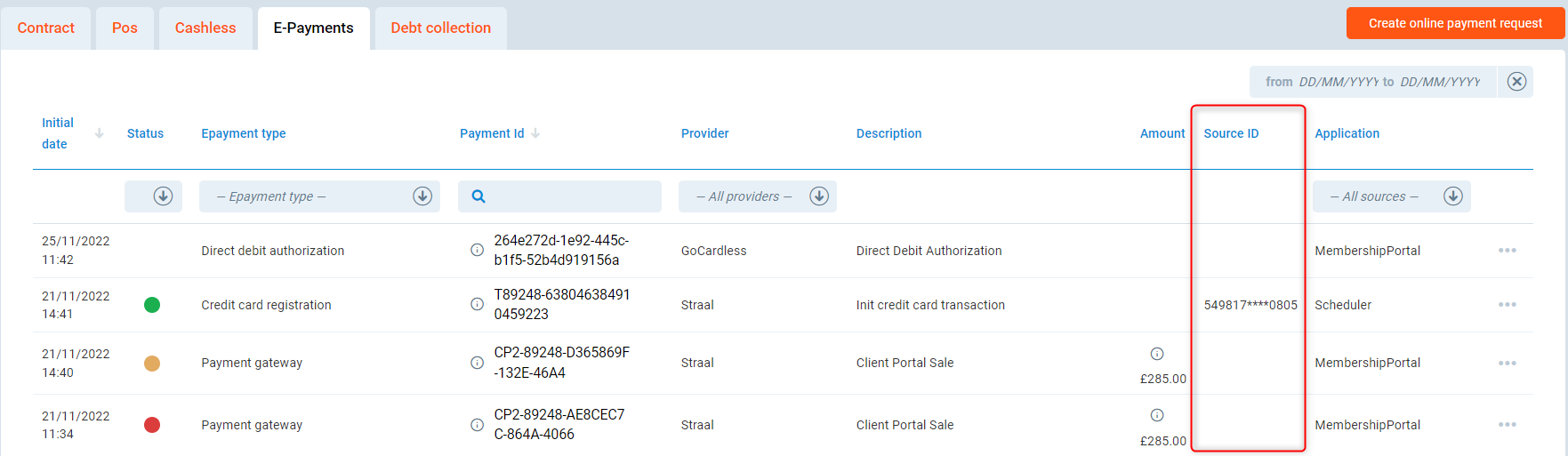 Source ID - displays member's payment source number, i.e. credit card or bank account number.