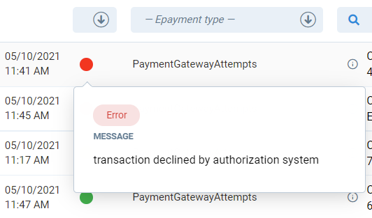 - To check detailed status or error message of payment click on the status circle.