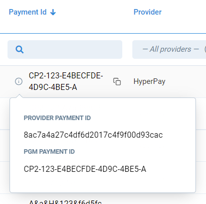 - To see PGM payment ID and Provider payment ID, click info icon on the left of the Payment Id field.