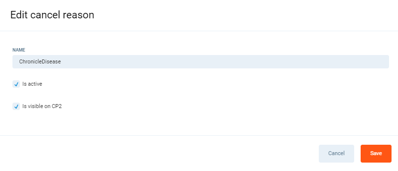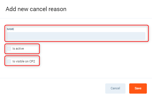 - Name - Enter in the name of the cancel reason, this will be on display in all applications.