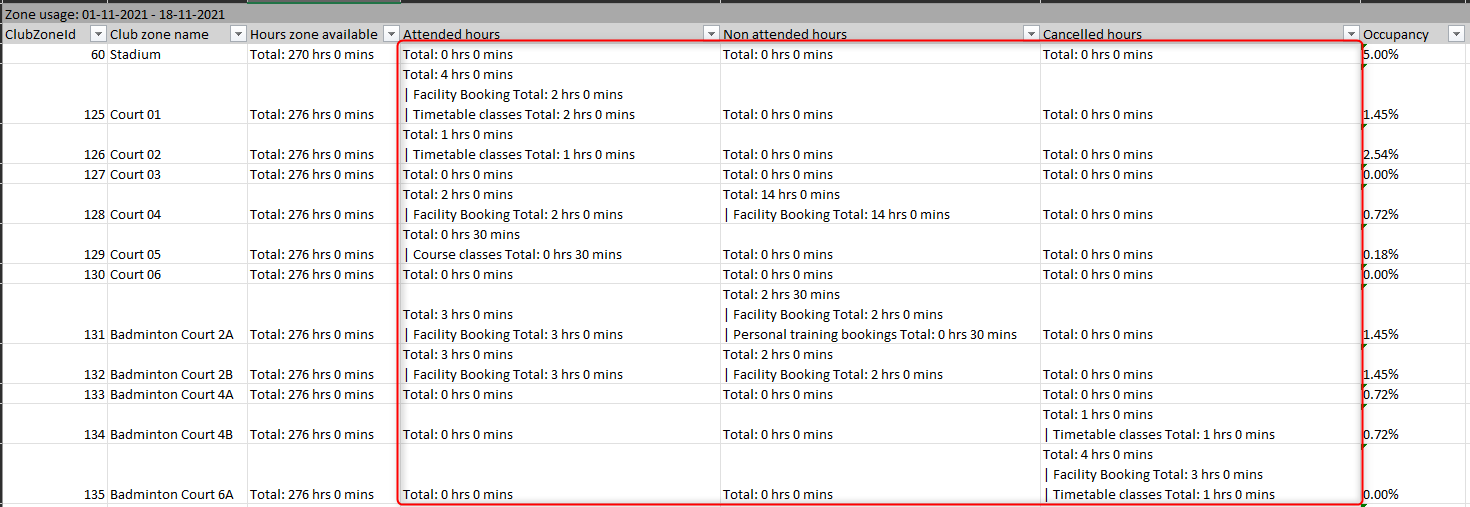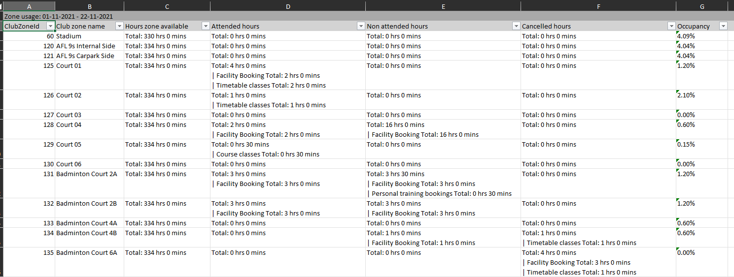 Occupancy - This is a percentage of the total hours available and the attended hours field. The parent zone calculations include the children zone.