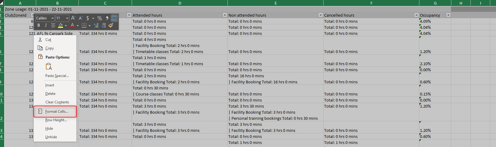 Cancelled hours - This is the total amount of facility bookings, personal training, classes and courses which were cancelled on the club zone for the period.