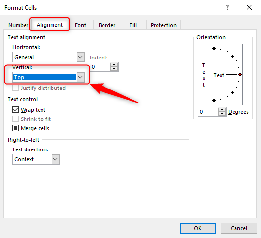 Go to the alignment tab and in Vertical press Top.