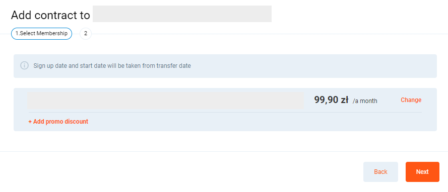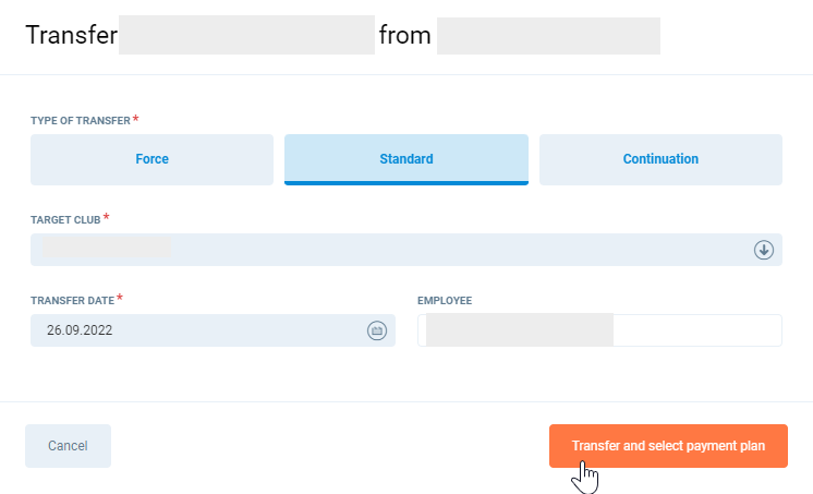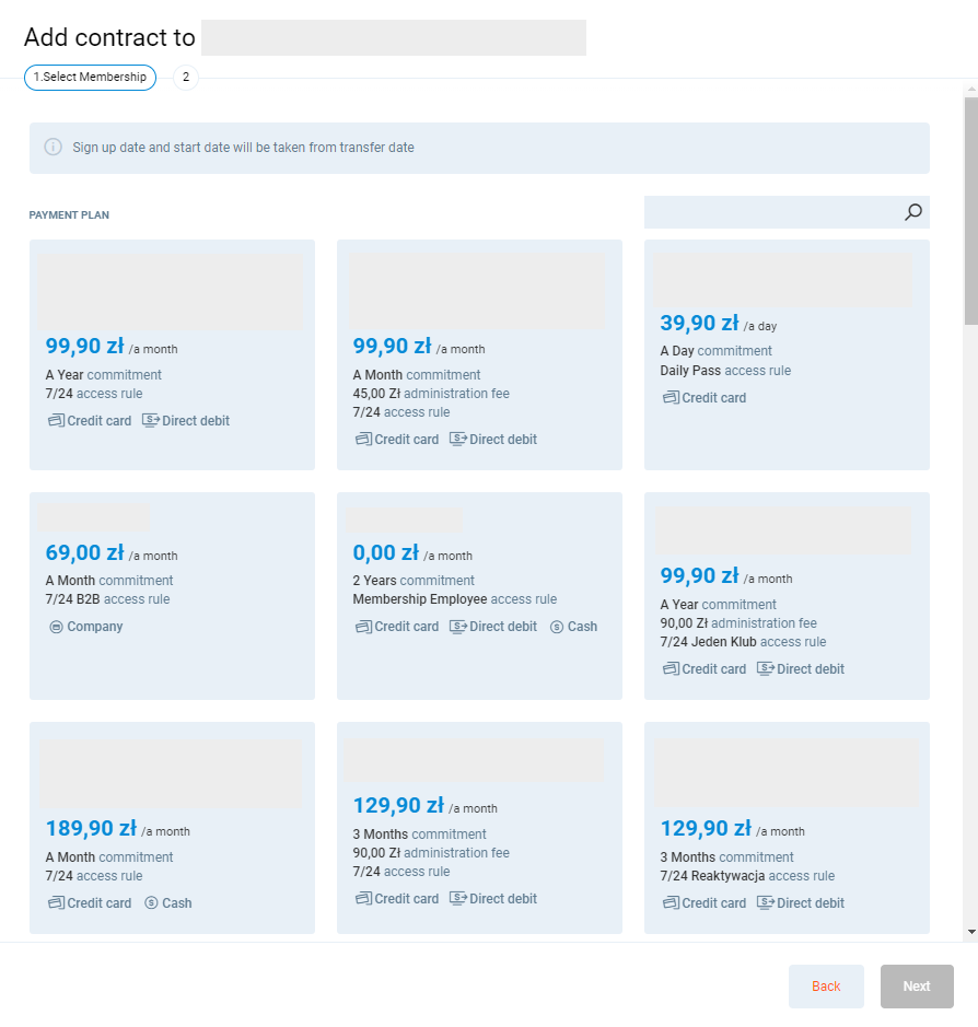 - For Standard and Continuation type, click Transfer and select payment plan to configure a contract in new club.