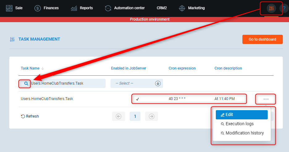 - Use the search box to find this task. If the task is active, you will see a tick in Enabled in JobServer. Cron description value means the time this task will be executed. This value can be adjusted by the club.