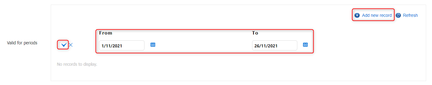 Valid for periods - Press Add new record to create a new date range, Enter in dates in From and To fields then press the tick icon to the left of the date range to save the dates.