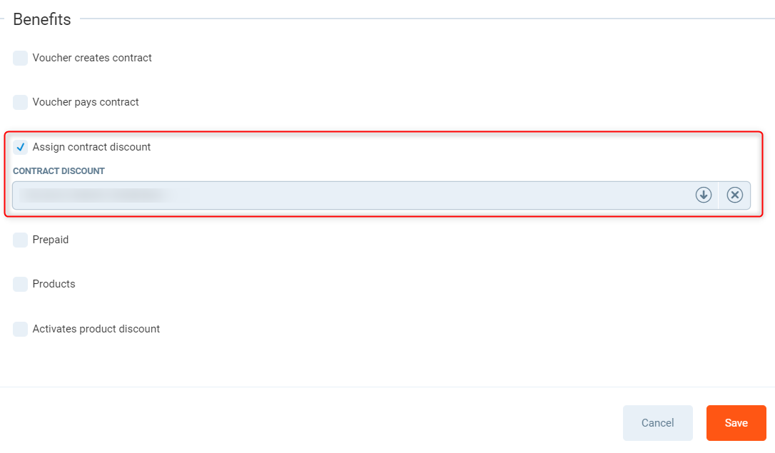 Assign contract discount - Select the contract discount you wish to assign the voucher type to. Only 1 contract discount can be assigned per voucher type.