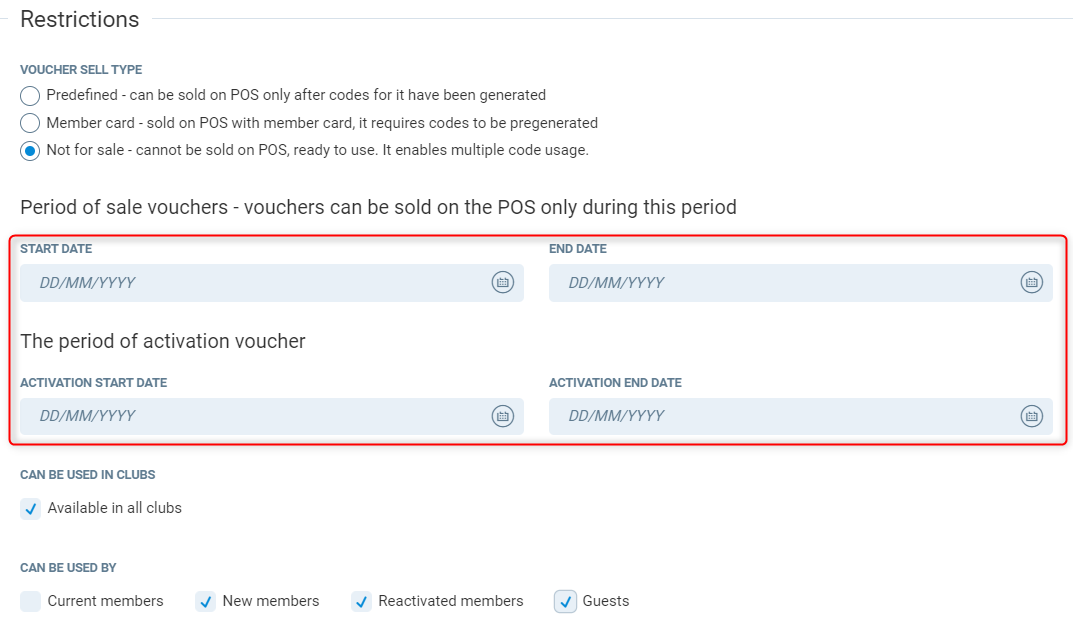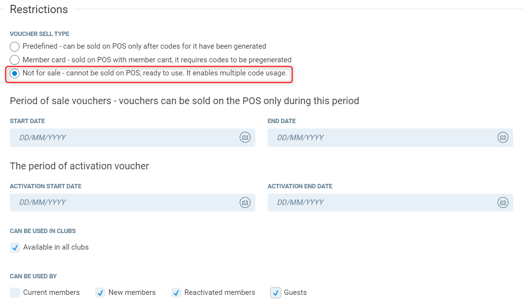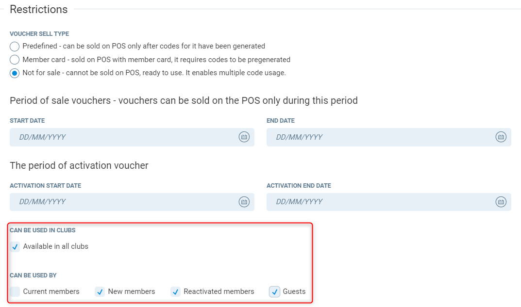 Can be used in clubs - If ticked, this will be available in all clubs. If unticked you can select which club this voucher type can be used in.