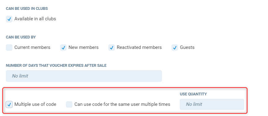 Multiple use of code - Selecting this option will allow the same code to be used multiple times. If you wish to restrict how many times it can be used, enter in a quantity in Use quantity.