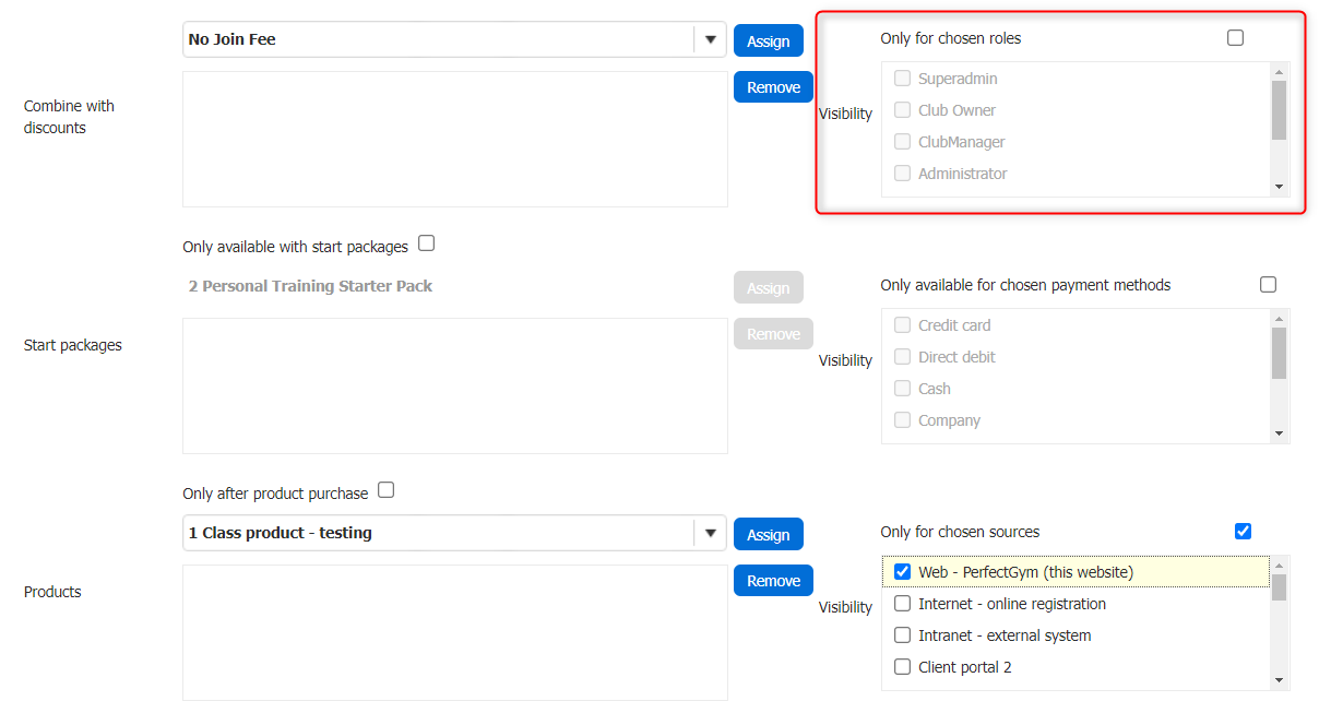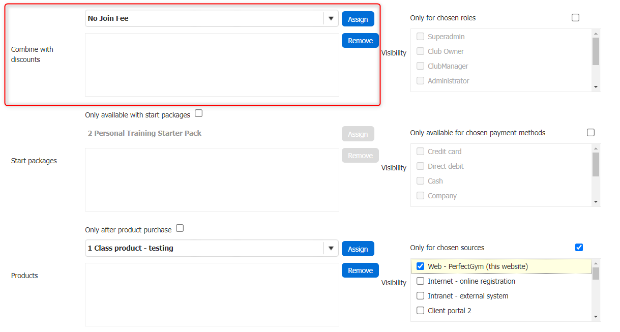 - ClientPortal - This will automatically add the contract discount during the contract creation phase on client portal. Please select this and ClientPortal2. If you wish to use voucher codes, please ensure this is not selected.