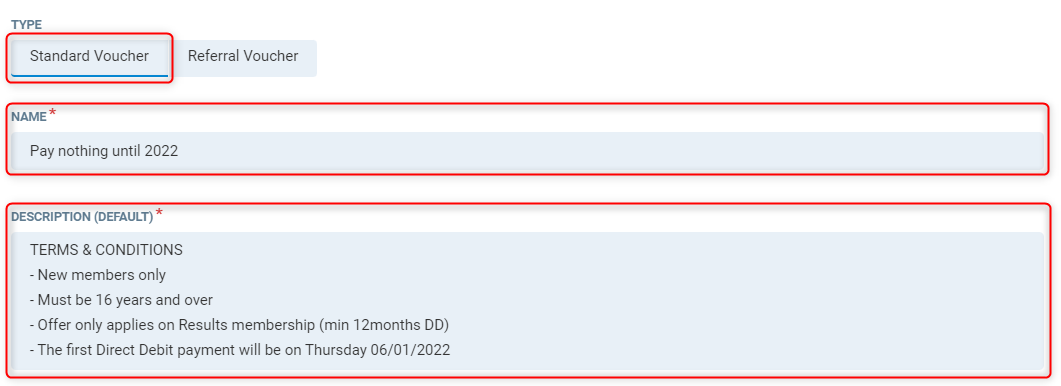 Description - Create a full description of the voucher, this will be displayed on Client Portal. It is recommended to provide a full description of what is involved in the contract discount.