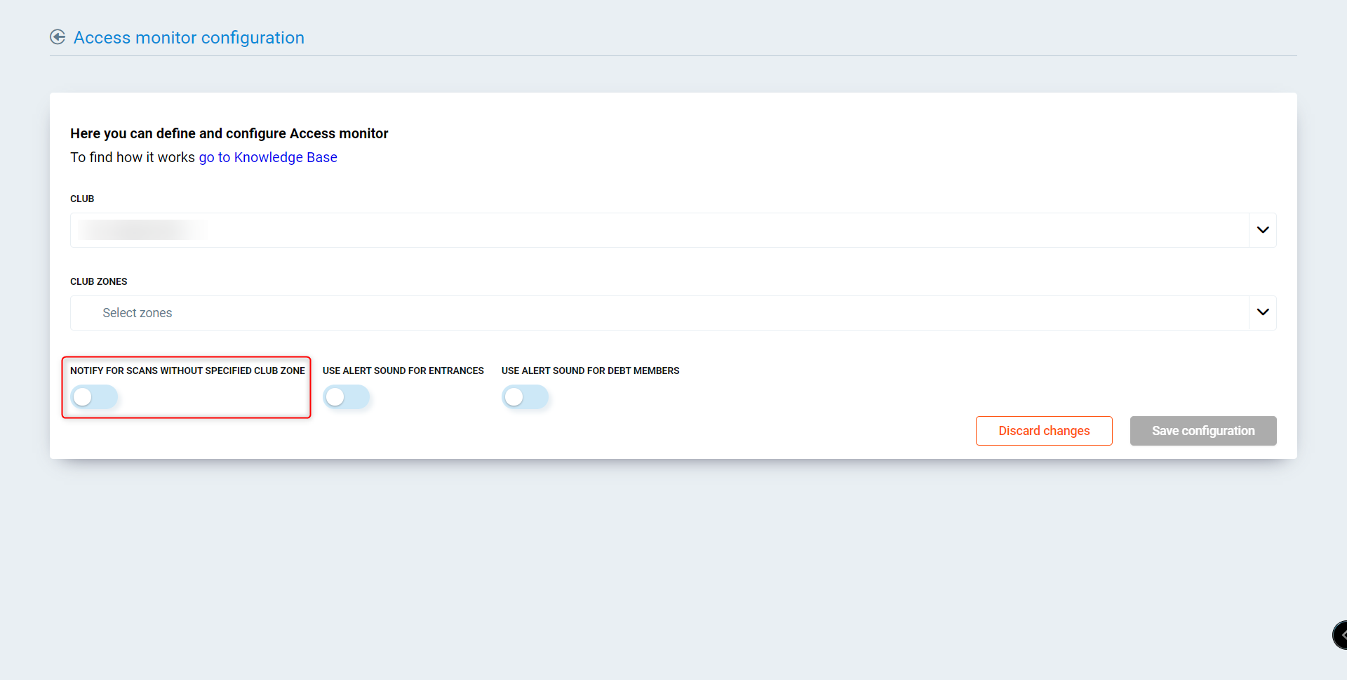 Steps/Settings: Check Notify for scans without specified club zone. This alerts the staff if a scan comes from a door not currently selected in the Club Zones dropdown.