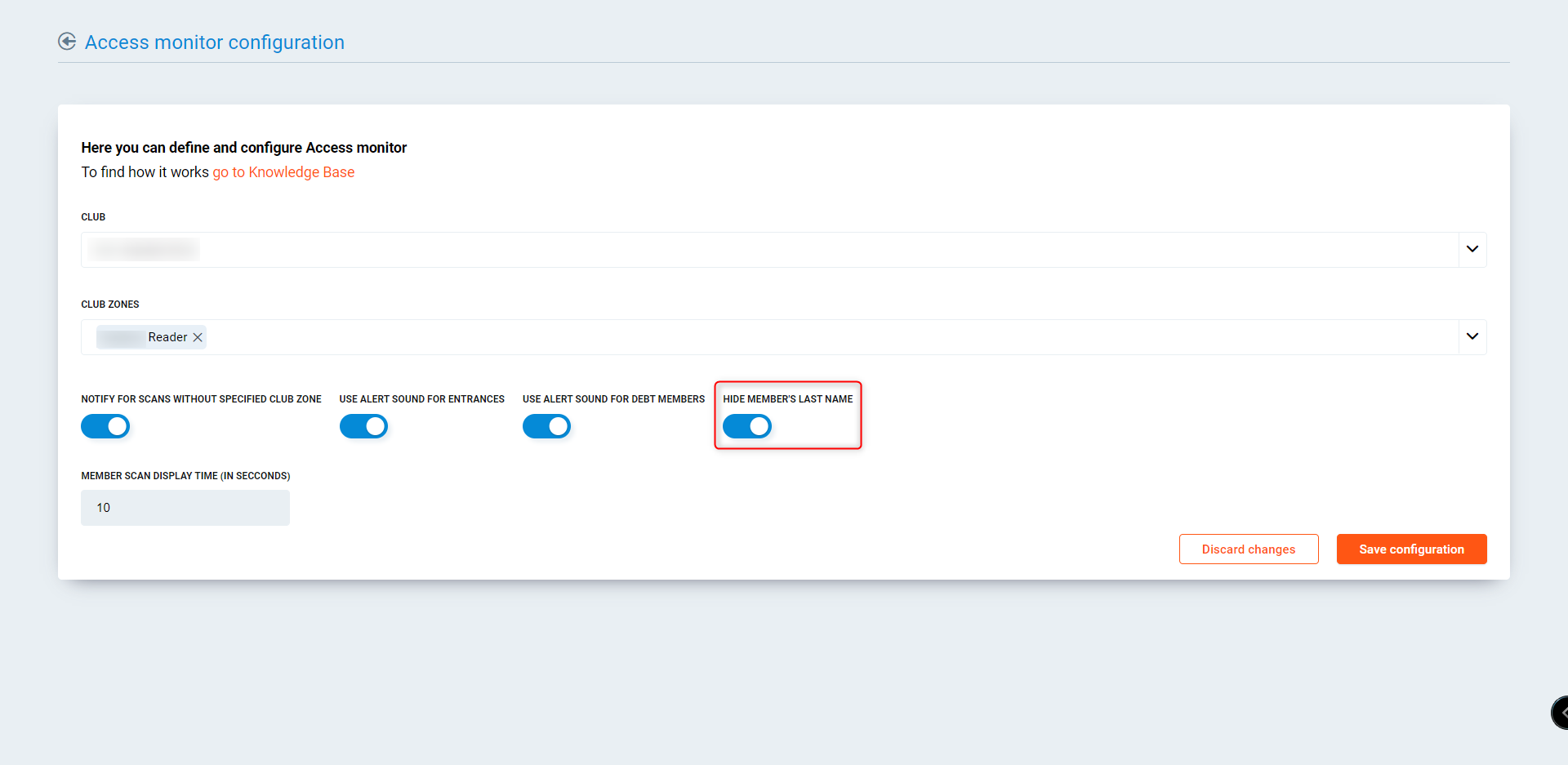 Hide members last name - Ability to hide the members last name on the access monitor when they are visible. This is useful if the screen is visible to the members.