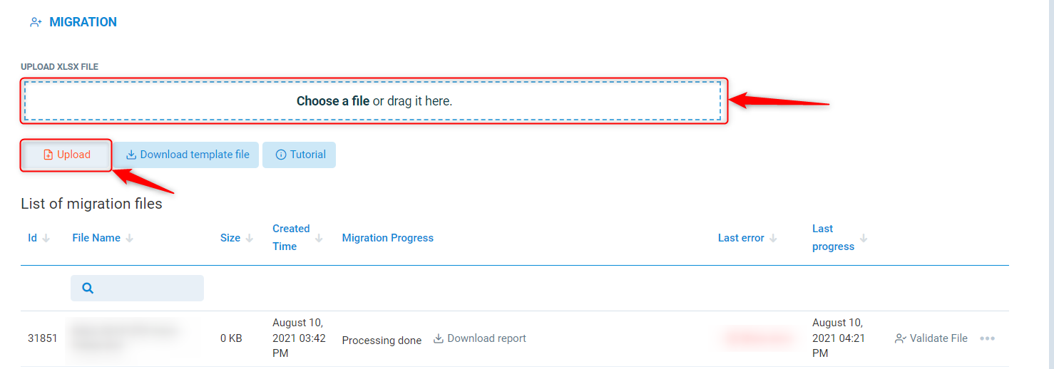 In Upload XLSX file, drag the file in the area surrounded by the dotted lines, or press Choose a file and find the file within the file directory of your computer.