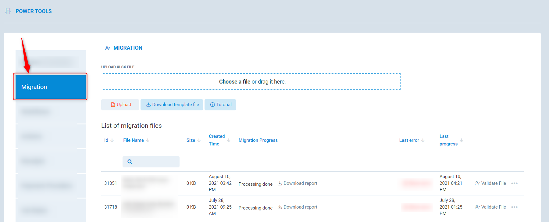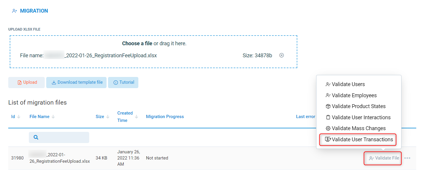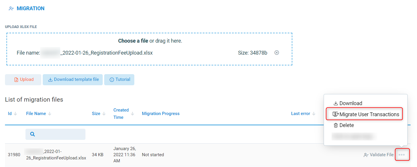 Once the file is validated, press the three dots to the right of the file name, this will open up a pop up window, press Migrate User Transactions to upload all transactions.