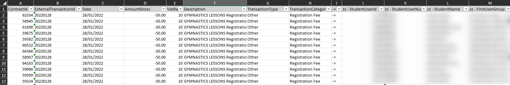- TransactionCategory - Transaction category set to 'Registration Fee'. This will allow the report to identify if the club member has a registration fee already added to their profile or not. Please do not modify this field.